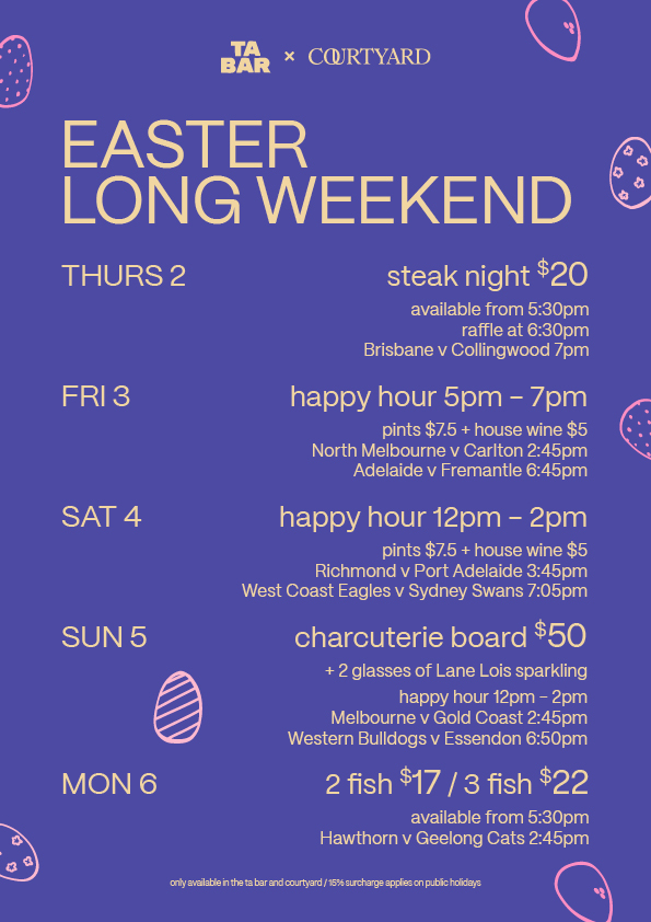 From happy hour sessions and footy on the screens to charcuterie boards, raffles and all the good stuff in between — TA Bar & Courtyard is where you want to be this Easter Long Weekend 🍻✨