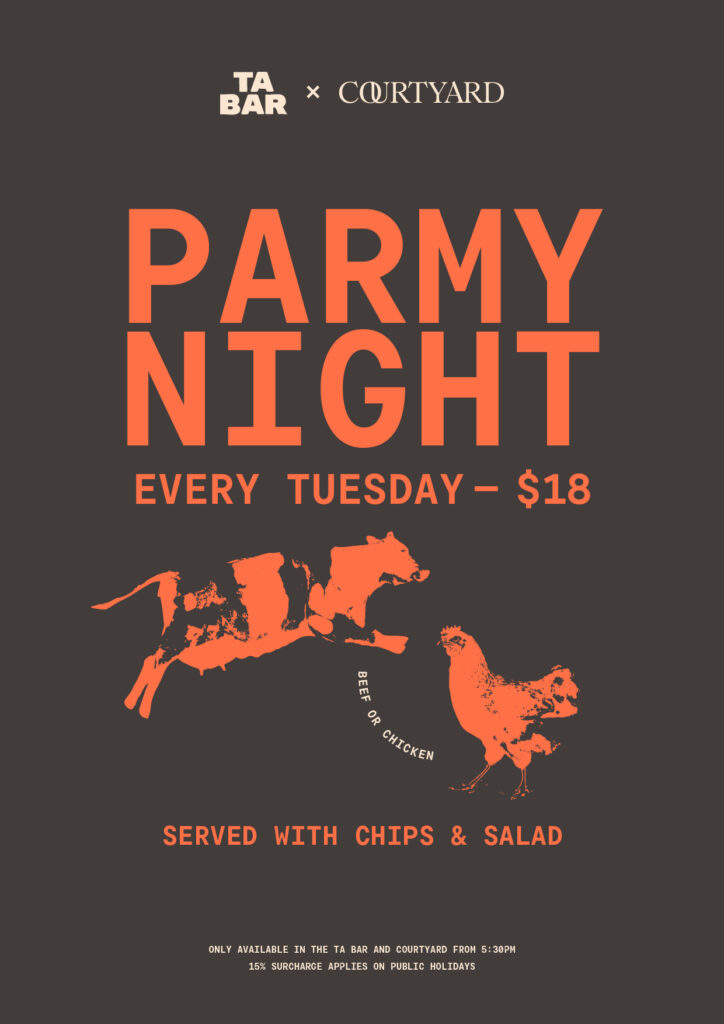 Every Tuesday night grab a Chicken or Beef Parmy with chips and salad for only $18!*